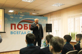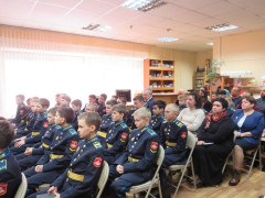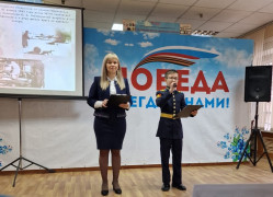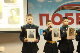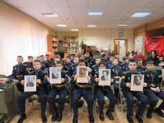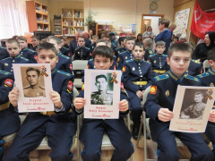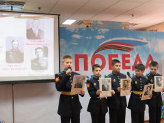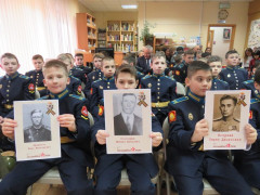 Ведущими мероприятия выступили преподаватель русского языка СПКУ Марина Александровна Бовина и её воспитанник Данияр Янгалычин (6 «В» класс). На открытии акции прозвучало видеоприветствие от Донецкой Республиканской библиотеки для детей им. С.Н. Кирова. После демонстрации проморолика и портала акции, который будет отражать участие детей и подростков из разных регионов России, кадеты 5 «Б» класса нашего училища Алан Чехов, Максим Киреев, Родион Малахов, Роман Смоленский, Семён Звада рассказали о подвигах прадедов, а кадет 6 «В» класса Инар Лихов проникновенно прочитал стихотворение о войне. Слова, обращённые к своим дедам и прадедам, позволили ещё раз осознать неразрывную связь поколений, понять, как важно сохранять историческую память и дорожить миром.