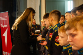 После клятвы воспитанники получили главный атрибут участника Движения – значок Первого! Нагрудные знаки кадетам вручили почётные гости.