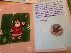 Воспитанники написали новогодние поздравления с добрыми словами и тёплыми пожеланиями в поддержку российских военнослужащих, выполняющих боевые задачи. Нарисовали тематические рисунки и сделали поделки, применяя технику оригами, аппликации и прочее. Работая над такой новогодней открыткой, кадеты прониклись чувством патриотизма и гордости за героичность и смелость тех, кто надёжно охраняет мирное небо над головой!