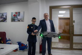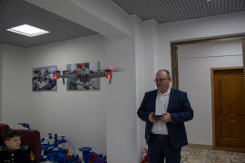 Следующее здание – «Институт механики и энергетики». По пути к нему мы видим на территории университета образцы сельскохозяйственной техники: комбайн и трактор, а также небольшой парк отдыха и памятник в честь погибших в Великой Отечественной Войне студентов и преподавателей. В здании Института механики и энергетики висит доска в честь памяти героя, погибшего на СВО. Михаил Анатольевич показывает высший пилотаж на дроне, сначала на маленьком «Пионер», а потом на большом «AIR 2S». Эти дроны предназначены для мониторинга оборудования, систем орошения садов и полей, анализа состояния посадок, контроля выполнения заданий, охраны территорий.
