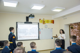 В рамках научно-исследовательского фестиваля «Научная среда – 2023» кадеты 7 «Б» класса Ставропольского президентского кадетского училища приняли участие в открытом занятии по русскому языку, посвящённом Сталинградской битве. Провела его преподаватель ОД (русский язык и литература) Людмила Александровна Молоканова.