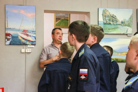 Но кадетам-фотографам в день экскурсии в картинную галерею представился уникальный случай познакомиться ещё с одним художником, которому ребята смогли лично пожать руку. В этот день состоялось открытие персональной выставки картин ставропольского художника Павла Лебедева «Крым от Феодосии до Севастополя. Рассветы». Павел Валерьевич Лебедев ещё в детстве занимался в художественной школе, но жизнь распорядилась иначе. Увлёкся спортом и юриспруденцией. Лишь пару лет назад, в 2021 году, он начал активную творческую карьеру. Это лето он посвятил Крыму. О своём летнем пленэре, об истории создания картин, о своей творческой деятельности художник рассказал кадетам. Ребята с увлечением слушали и задавали вопросы.