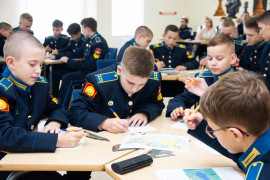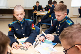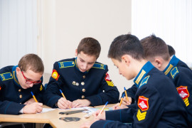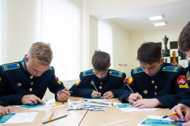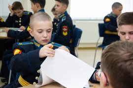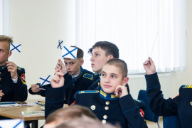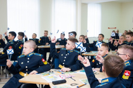 Затем педагог попросила кадет описать изображение Андреевского флага. «Часть плоскости, на ней пересекающиеся прямые», «четыре угла», «углы острые и тупые», «лучи», «смежные углы», – отвечали кадеты.