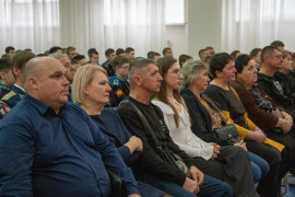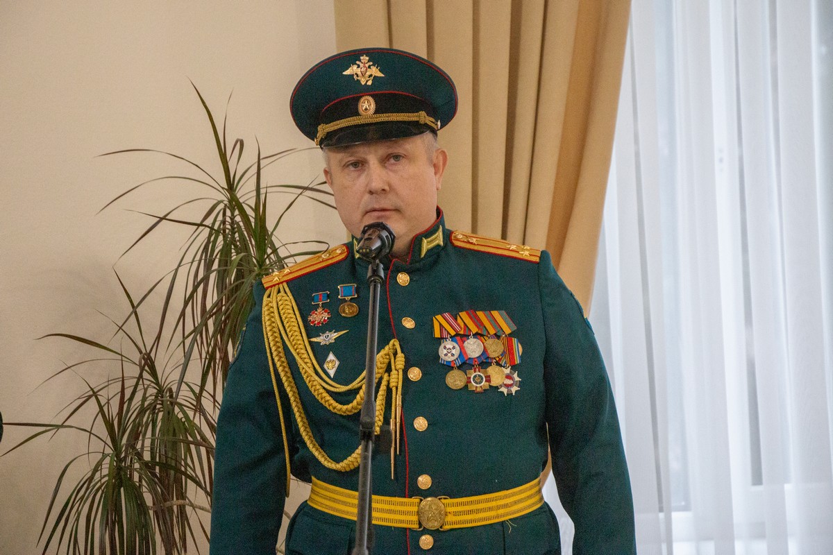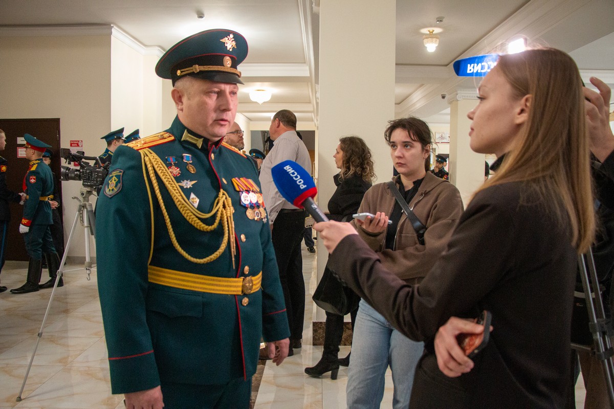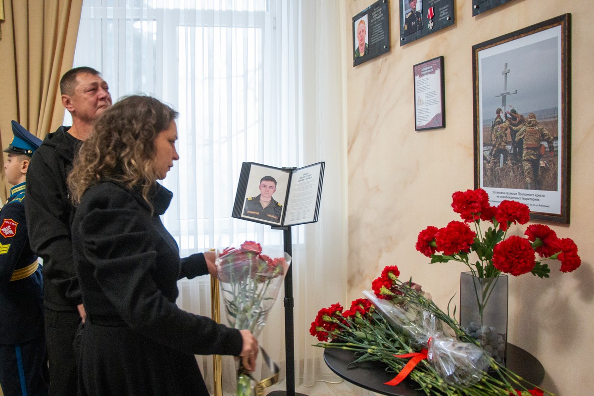 – Трудно говорить какие-то слова в такие моменты. Но Герои в России всегда были, есть и будут. Сегодня мы здесь собрались для того, чтобы увековечить память наших сотрудников и наших выпускников, которые отдали свою жизнь, разменяли её на жизни других сотни тысяч жителей на той территории, которая сейчас ещё не в полной мере освобождена. Мы сегодня открываем мемориал, на котором навсегда в нашей памяти будет находиться Бессмертный полк СПКУ. Кроме портретов наших Героев в мемориал у нас входит карта боевых действий, на которой показано, где наши сотрудники и выпускники участвуют в боях, а где погибли… Карта постоянно будет корректироваться с учётом освобождения наших территорий. В центре мемориала фотография. Этот снимок нам привёз атаман российского казачьего войска. На нём запечатлено, как они устанавливают крест в населённом пункте Работино. Крест устанавливали под ударами дронов. Именно там в этот момент погиб один из наших сотрудников.