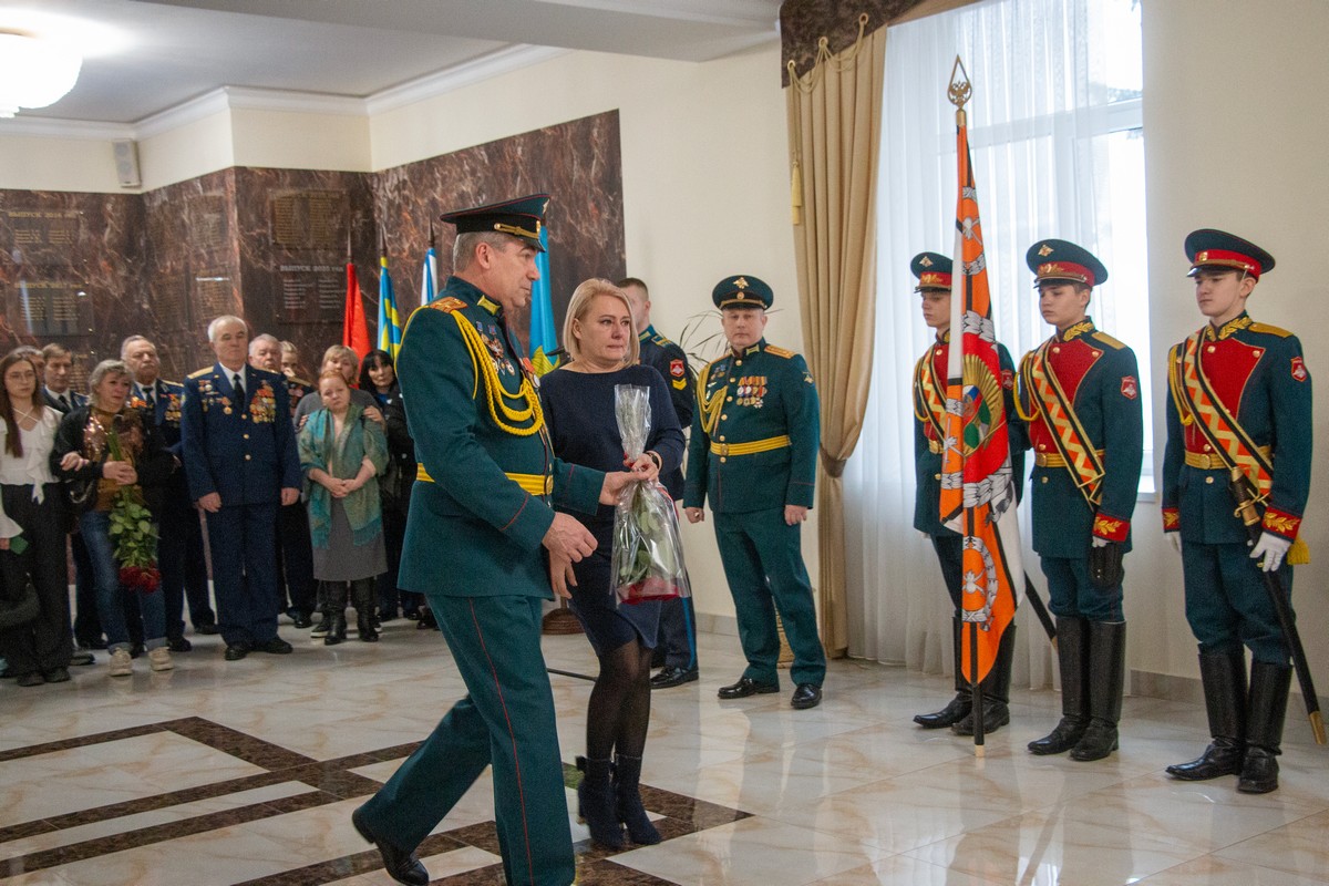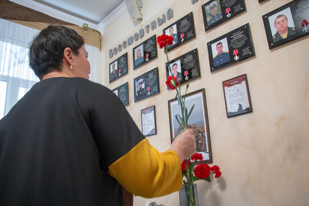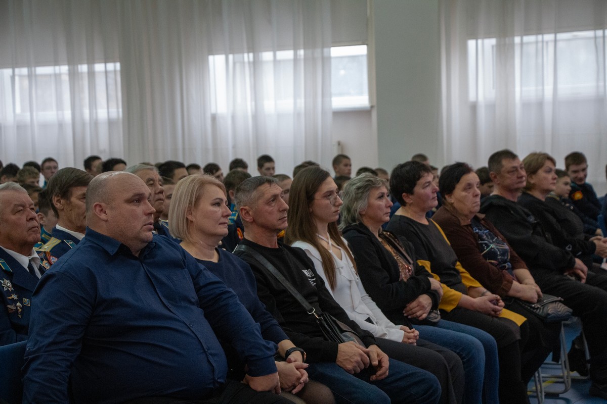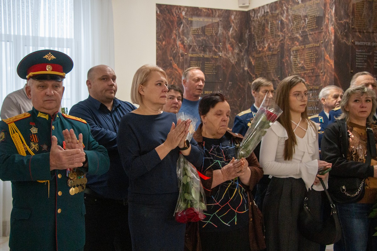 После минуты молчания, которой почтили память погибших героев, право открыть Стену Памяти было предоставлено кадету 6 учебного курса СПКУ Хасану Калицеву и матери погибшего в зоне проведения СВО выпускника училища.