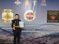 Роман Леонов стал призёром Всеармейского конкурса-выставки изобразительного искусства среди военнослужащих по контракту и членов их семей «Армейский калейдоскоп 2024» в возрастной категории от 9 до 13 лет. Его работа под названием «Герой моего времени» заняла II место.