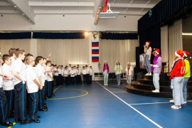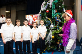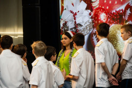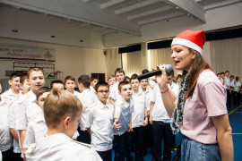 Вечер начался с приветственного танца студенческого педагогического отряда «Нон-стоп», где кадеты повторяли несложные и всем известные танцевальные движения. И только воспитанники разогрелись и вошли во вкус, как красивая новогодняя ёлочка потухла и никак не хотела загораться. Повезло, что студенты пригласили с собой мудрых эльфов, которые готовы были помочь кадетам устранить техническую неполадку. Для этого пятиклассникам необходимо было выполнить непростые задания позитивных мудрецов, ответить правильно на их загадки и помочь им перебрать письма Дедушке Морозу. Дружные кадеты справились со всем с лёгкостью и азартом! Ёлочка снова начала гореть разноцветными огнями, весёлый вечер продолжался, а добрые эльфы с удовольствием присоединились к веселью кадет! Весь вечер сопровождался музыкой, ликованием кадет и зажигательными танцами эльфов.