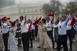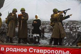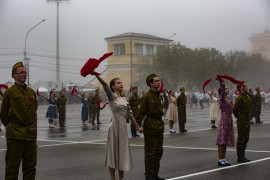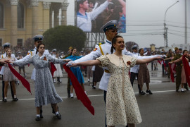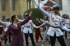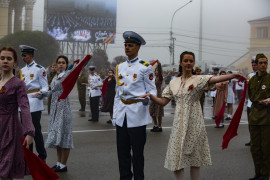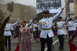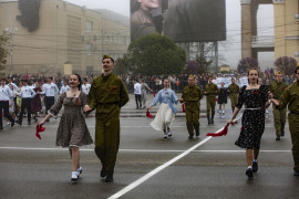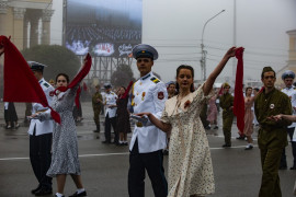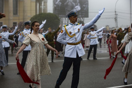 Завершился парад «Вальсом Победы». Под военные песни в вальсе закружились около тысячи парней и девушек, в том числе и кадеты 11-х классов Ставропольского президентского кадетского училища.