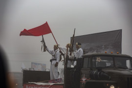 После демонстрации боевой техники на площади началась театрализованная часть парада: появились передвижные диорамы с актёрами. Декорированные автомашины демонстрировали главные исторические вехи Великой Отечественной войны 1941-1945 годов и времени восстановления страны. В этот раз была добавлена ещё одна «страница» истории Великой Отечественной войны – открытие суворовских военных училищ в 1943 году. В этой инсценировке участвовали кадеты младших классов АДЕККК и СПКУ.