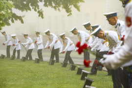После торжественного построения воспитанники возложили цветы к мемориальным табличкам возле каждого дерева «Аллеи памяти городов-героев и крепости-героя», которая была посажена на территории училища накануне Дня Героев Отечества в 2020 году.