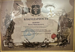 За активное участие в патриотических конкурсах Вооружённых Сил Российской Федерации кадетам 8Д класса Ставропольского президентского кадетского училища Назару Нестеренко и Ивану Попову директор Департамента культуры Министерства обороны Российской Федерации А.В. Горный вручил благодарность.