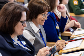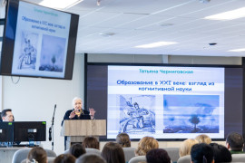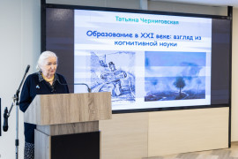 С докладом «Образование в XXI веке: взгляд из когнитивной науки» выступила Татьяна Черниговская – директор Института когнитивных исследований СПбГУ, доктор биологических наук, доктор филологических наук, академик Российской академии образования. Также перед собравшимися выступили Валерия Карпинская, доктор психологических наук, профессор Института когнитивных исследований СПбГУ, и Татьяна Мамина, кандидат психологических наук, старший научный сотрудник того же института.