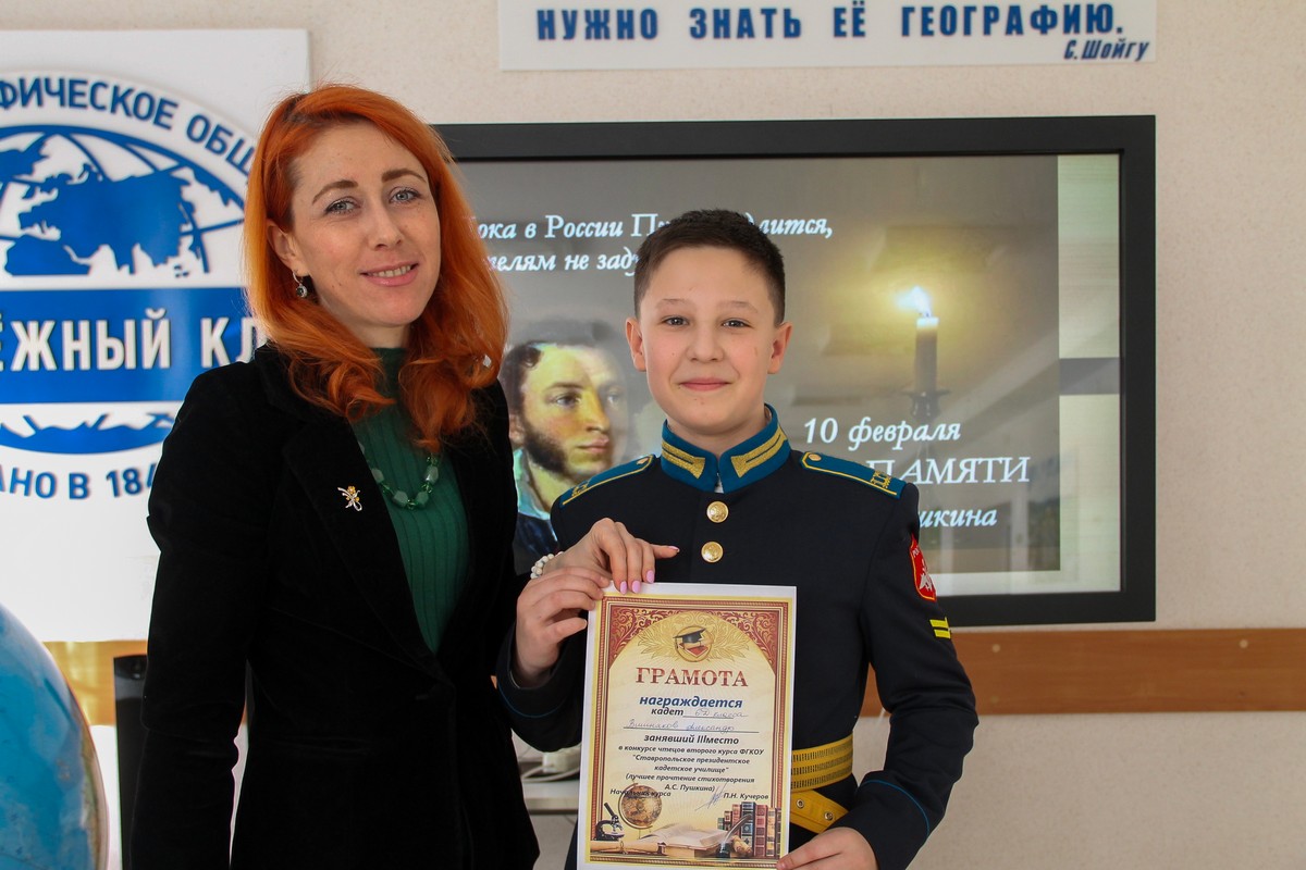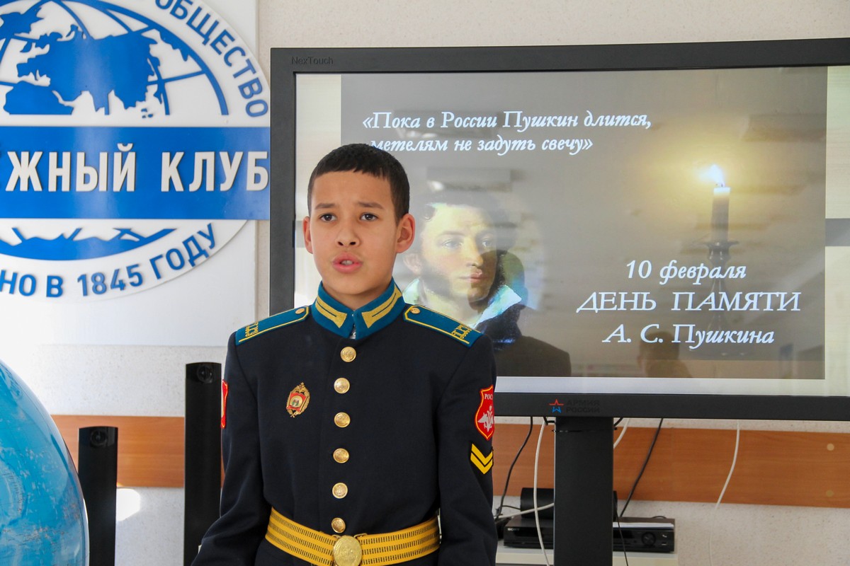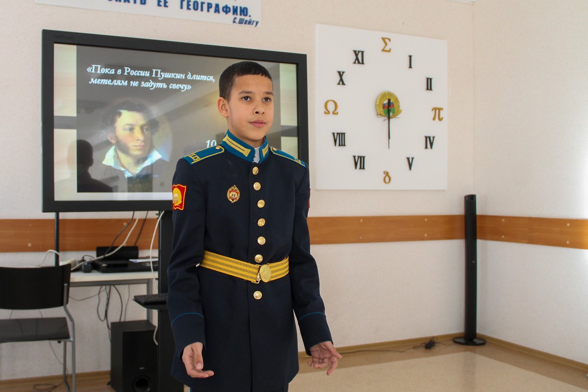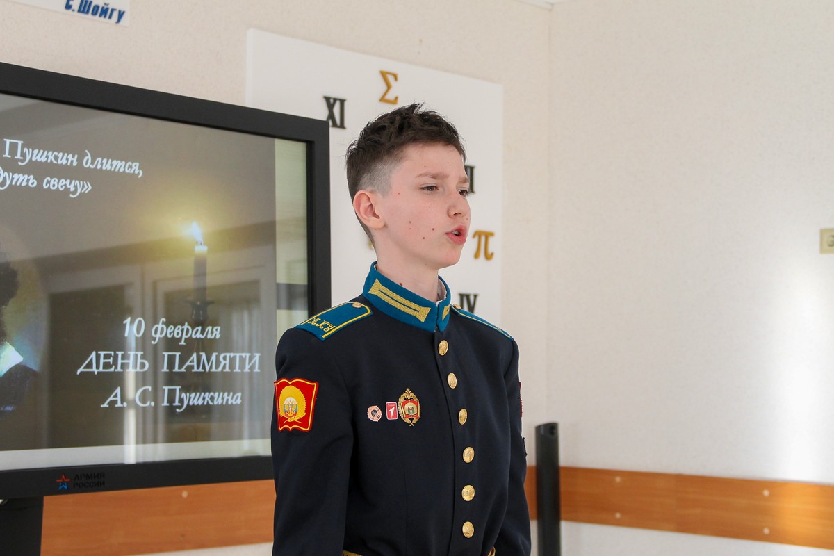 10 февраля в России традиционно отмечается День памяти Александра Сергеевича Пушкина — знаковая дата для отечественной культуры. В Ставропольском президентском кадетском училище эту дату почтили по-особенному: педагог-организатор второго курса Элина Александровна Легкодух провела среди кадет 2 учебного курса конкурс чтецов, посвящённый творчеству великого поэта. От каждого класса было делегировано по два представителя, которые наизусть исполняли одно из произведений Пушкина на выбор. Возглавила компетентное жюри культорганизатор училища Елена Григорьевна Сиротова.
