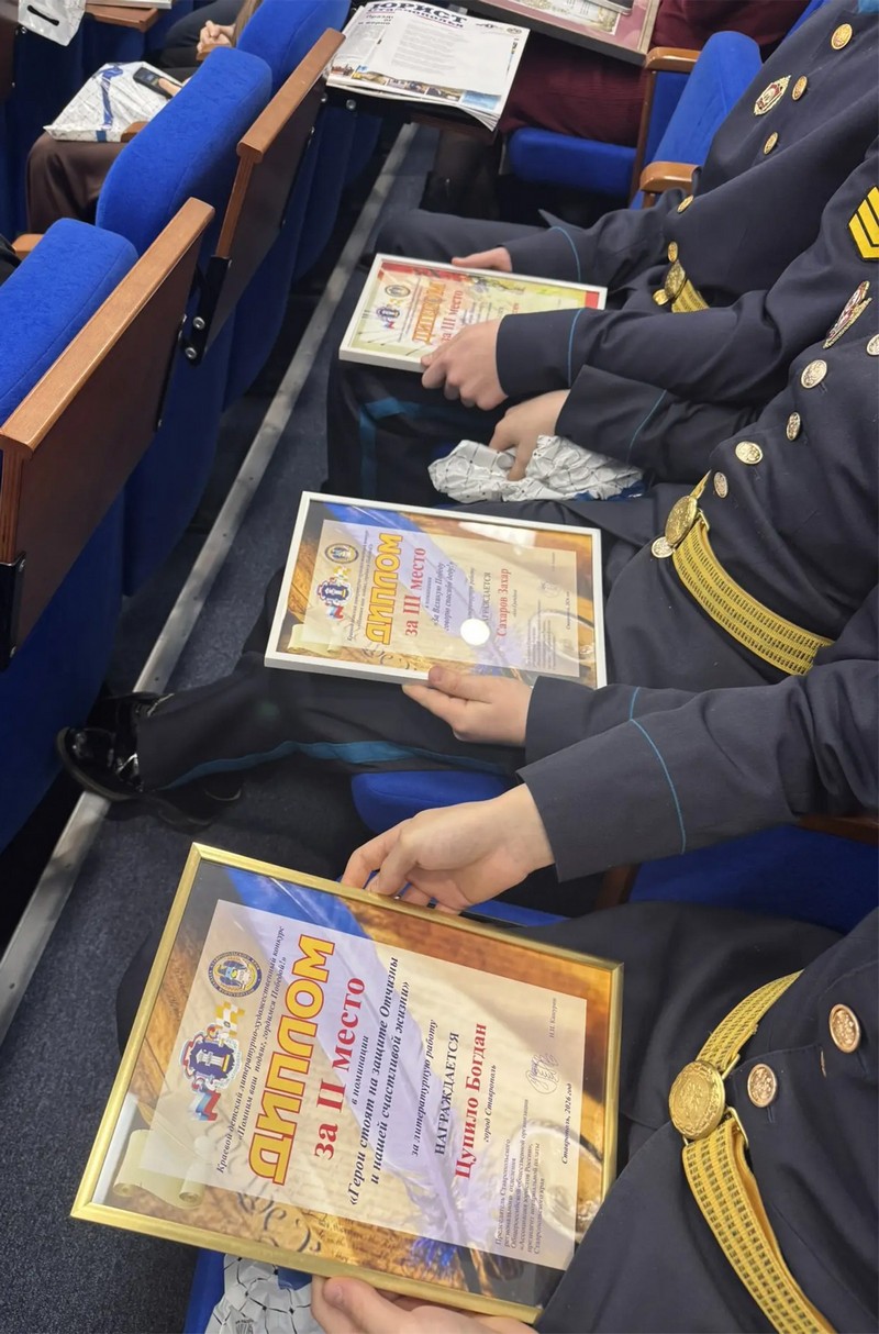 Среди победителей и призёров номинаций оказались кадеты СПКУ. Победителем в номинации литературное творчество «Герои стоят на защите Отчизны и нашей счастливой жизни» стал Першин Александр 6В класс (руководители педагоги ДО «Кадетский театр. Искусство побеждать» Оксана Сергеевна Романова и Елена Григорьевна Сиротова).