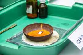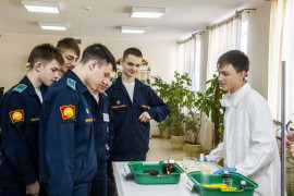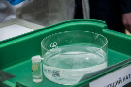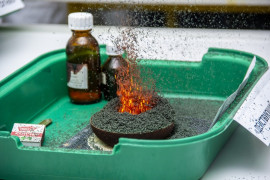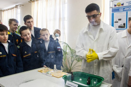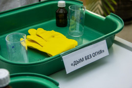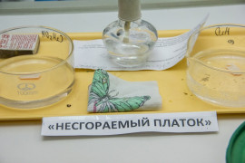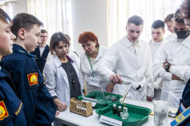 Елена Борисовна Казановская вместе с помощниками – кадетами 5 курса, девятиклассниками Богданом Галушко, Кириллом Докуз и Иваном Рязановым – удивляла демонстрацией процессов вулканической деятельности. Зрителям особенно понравились опыты «Металл, бегающий по воде», «Нанесение раны и её исцеление», «Бешеная пена».