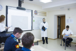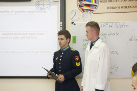 На занятии кадеты 11 «Г» класса (естественно-научный профиль) рассказывали о генной инженерии, о практических и этических аспектах изменения ДНК человека, о возможности создания универсального солдата с улучшенными физическими и умственными возможностями, способного обходиться долгое время без еды и воды.