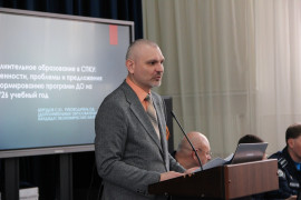 Затем с основным докладом «Дополнительное образование в СПКУ: особенности, проблемы и предложения по формированию программ ДО на 2025/26 учебный год» выступил руководитель ОД (дополнительных образовательных программ) Сергей Юрьевич Борздов.