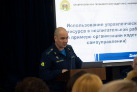 В Ставропольском президентском кадетском училище состоялось очередное заседание педагогического совета. В этот раз его основная тема звучала так: «Поиск и применение педагогических ресурсов в целях повышения качества образования (на материалах передового опыта педагогов СПКУ)». Началось заседание педсовета с приветственного слова ко всем педагогам начальника Ставропольского ПКУ, кандидата технических наук, профессора Вячеслава Валерьевича Преснухина.