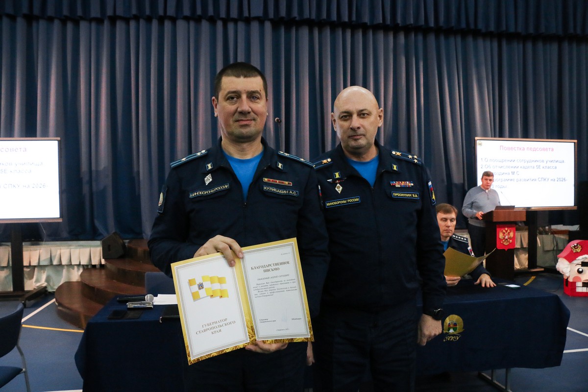 Заседание педагогического совета стало завершающим событием уходящего календарного года в Ставропольском президентском кадетском училище. В этот раз заседание педсовета прошло не совсем в обычном формате и было поделено на две части – официальную (с церемонией торжественного награждения) и праздничную (с концертной программой и поздравлениями с наступающим Новым годом). Открыл заседание традиционно с приветственным словом ко всем педагогам начальник Ставропольского ПКУ, кандидат технических наук, профессор Вячеслав Валерьевич Преснухин.