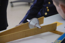 Во время внеурочного мероприятия ребята проводили опыты. Кадеты определяли, почему тело катится вверх, против всех законов физики. Почему не падает сложная конструкция на краешке бутылки? Как объяснить, что рисунок переворачивается, если на него посмотреть через стакан с водой? Почему теннисный мяч самостоятельно располагается по центру водной поверхности полного стакана? И откуда берутся «силы» у газа, чтобы воспламенить кусочек ваты?