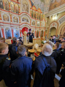 Отец Игорь подробно рассказал об истории Храма, познакомил кадет с сюжетами из Евангелие, изображенными на стенах Храма, подробно остановился на каждом образе, почётно разместившемся на деревянном Иконостасе. Больше всего кадет впечатлил открытый Алтарь, который кадеты увидели впервые. После интересной экскурсии кадетам разрешили подняться на колокольню и осмотреть красоту прилегающей к Храму территории, а Отец Игорь напоил всех присутствующих липовым чаем, собранным лично на территории Храма.