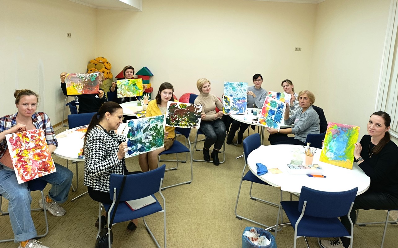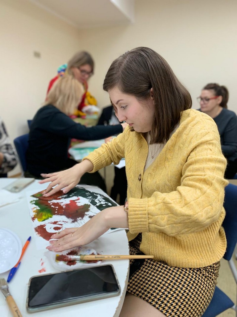 В начале арт-тренинга Илона Евгеньевна провела увлекательную вводную беседу о психологии цвета и его влиянии на наше эмоциональное состояние. Участники узнали, как разные оттенки могут пробуждать определенные чувства и воспоминания, и как это можно использовать для гармонизации своего внутреннего мира.