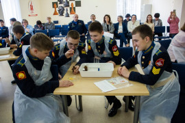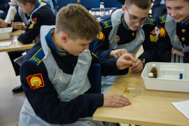 В начале урока перед кадетами стояла сложная задача: съесть чипсы или использовать их для опытов? Елена Борисовна предложила кадетам провести небольшое исследование и выяснить, какие полезные вещества содержатся в чипсах. Есть ли в них важные для построения тела человека белки? Кадеты провели качественную реакцию на белок куриного яйца, опыт повторили на ломтиках чипсов и выяснили, что в чипсах нет белков. Кадеты провели исследования на определение жирности чипсов и выяснили, что в них очень много вредных жиров. В ходе эксперимента оказалось, что не во всех исследуемых чипсах есть крахмал.
