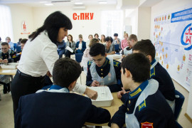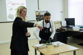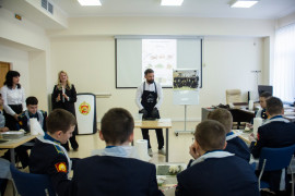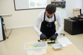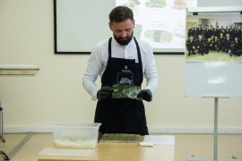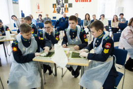 Есть ли альтернативная еда, которая готовится быстро, не менее вкусная, чем чипсы, но содержащая больше полезных веществ? Елена Владимировна рассказала кадетам о роллах, которые состоят из риса, морепродуктов, овощей, фруктов и морских водорослей. Специальный гость, который, согласно легенде урока, приехал из Японии и не знал русский язык, общался с кадетами на языке международного общения – английском. Анатолий Викторович показал кадетам и гостям на их личном опыте, что сделать ролл очень просто, главное – подобрать качественные и свежие продукты. А дальше – дело техники. Одним движением кадеты завернули всё в один ролл.