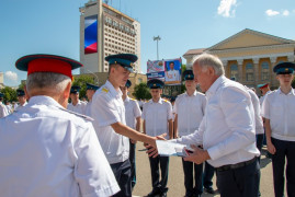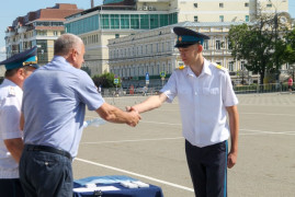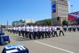 Праздничное мероприятие началось с построения и выноса на главную площадь краевой столицы Государственного флага Российской Федерации и Знамени Ставропольского ПКУ.