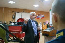 Вячеслав Семенович рассказал о создании первой пожарной службы в городе. Интересные истории из личного опыта. Затем кадетам продемонстрировали помещения, где дежурит и отдыхает бригада пожарных. Посещение гаража пожарных машин и возможность посидеть в кабине вызвал особенный восторг у кадет.