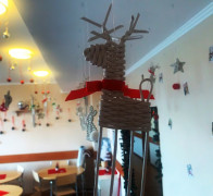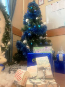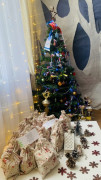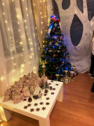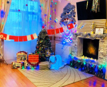 Яркими мириадами звёзд и гирлянд встречает гостей чайная комната 6 «Д» класса, оформленная в тематике «Звёздная дорога в новогоднюю сказку». Ёлка украшена мандаринами и имбирным печеньем. Рядом с ней стоит олень с санями, в которых лежат подарки и открытки для военнослужащих СВО.