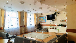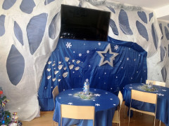 6 «В» класс назвал чайную комнату «В гости к Снежной королеве». Украшения комнаты и ёлки были подобраны в едином сине-белом стиле. Кадеты могли посидеть на настоящем ледяном троне Снежной королевы, покормить с рук оленя, привёзшего подарки нашим воинам, выполняющим свой воинский долг.
