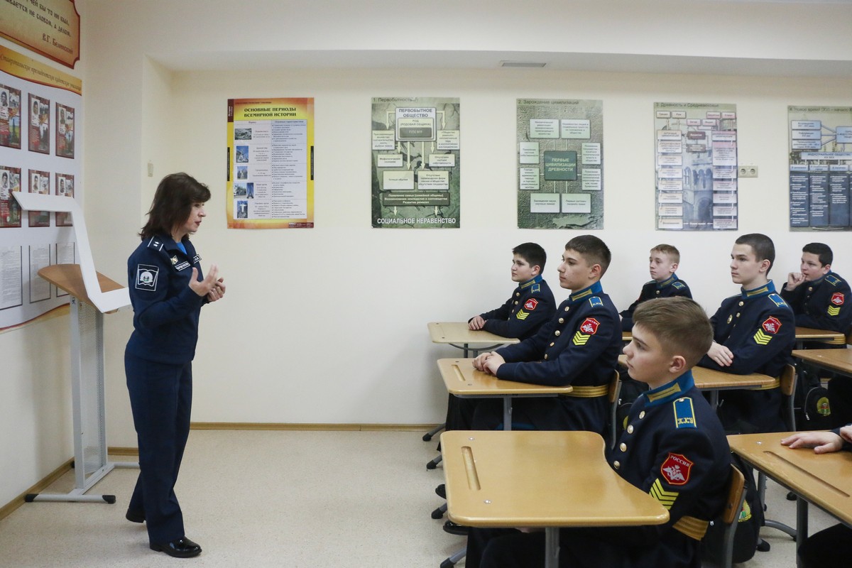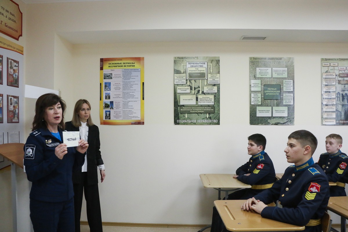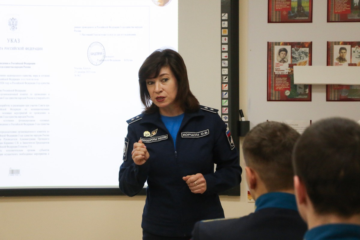 Патриотическое внеурочное мероприятие для воспитанников 8 «Г» класса Ставропольского ПКУ провели преподаватель ОД (иностранный язык) Марина Николаевна Денисова и воспитатель учебного курса Ольга Владимировна Коршун. «Жизнь – Родине...», - так оно называлось. 2026 год – особый. Он посвящён укреплению дружбы, мира и согласия между всеми народами нашей большой и многонациональной страны. Его главная цель – укрепить взаимопонимание между народами. Об этом рассуждали на внеурочном мероприятии кадеты вместе с педагогами.