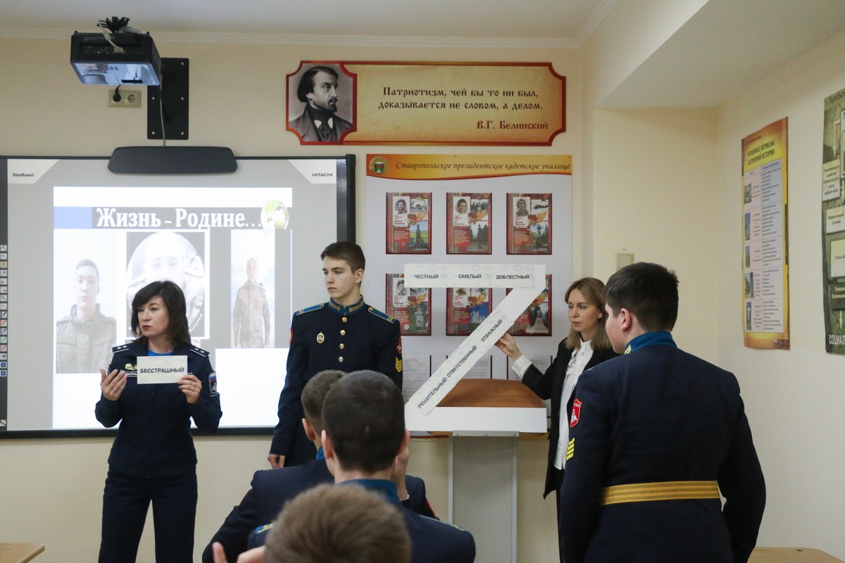 Самым ярким и запоминающимся моментом мероприятия были приветственные видеообращения от выпускников Ставропольского президентского кадетского училища 2019 года и родителей, находящихся на службе в зоне специальной военной операции. Совместно с преподавателем и воспитателем восьмиклассники наполнили символ «Z» прилагательными, описывающими образ современного защитника.