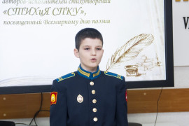 Завершило мероприятие выступление члена жюри, кадета 11 класса АДЕККК Максима Высочина, который давно увлекается авторской поэзией. Он говорил, о том, как мало места уделяется литературе в современном мире, о важности самовыражения, цитировал А.П. Чехова, Н.А. Заболоцкого, и пожелал всем участникам обязательно продолжать сочинять стихи.
