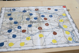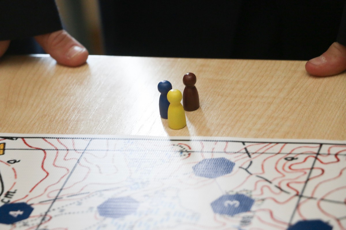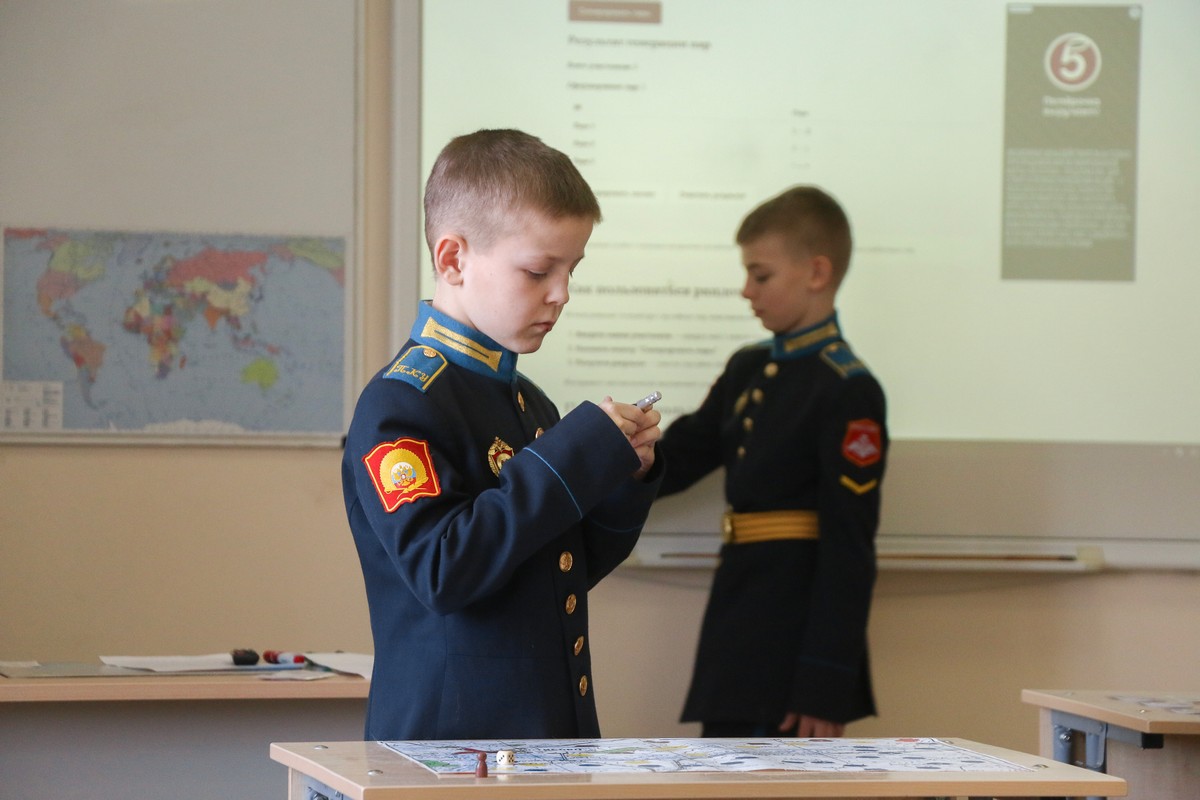 Команды всех 5-х классов стали участниками настольной топографической игры, по условию которой, участники должны были выбросом кубика выбрать дорожку определённого цвета, пройти по неё к финишу и выполнить задания по топографии. Каждая дорожка отличалась протяжённостью, количеством и сложностью заданий. С правилами команды знакомили ведущие игры – кадеты 4 курса: Максим Васькин, Михаил Гурьянов и Трофим Великдань – активисты Молодёжного клуба РГО «Сармат».