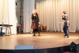В жанре «Художественное слово» актёрским мастерством блеснули Игорь Новиков (6Е) и его сестра Василиса, представив на суд жюри и радость зрителям композицию «Ой, Мишка, как же страшно мне».
