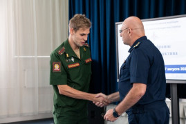 Затем начальник 1 учебного курса Пётр Николаевич Кучеров рассказал об итогах поступления выпускников СПКУ 2024 года в вузы Министерства обороны Российской Федерации.