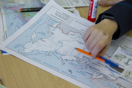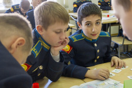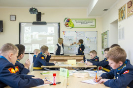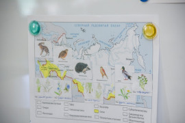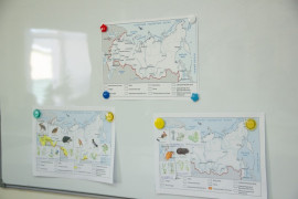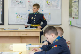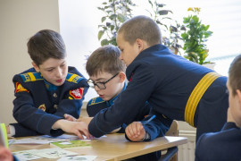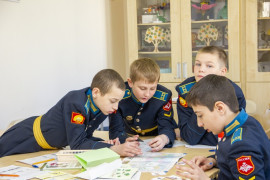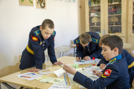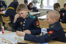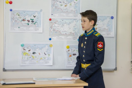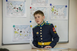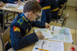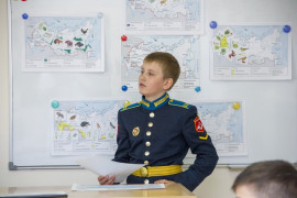 На уроке кадеты разбирались в расположении природных зон на карте России и выясняли особенности её флоры и фауны. Работая в группах, обозначили расположение зоны на контурной карте, определили видовой состав растений и животных, воспользовавшись атласами определителями и дидактическими карточками птиц и зверей.