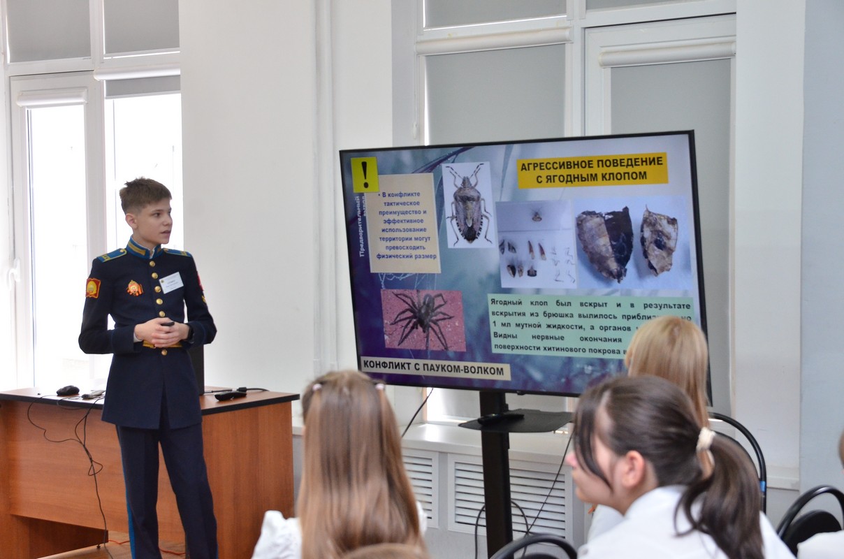 В номинации «Биология» (5-7 классы) выступил Иван Семко с работой «Изучение влияния факторов среды на поведение и выживаемость паука-тенётника в искусственных условиях» (руководитель – Мария Александровна Панченко). Кадет получил свидетельство об участии – ценный опыт для будущих научных свершений.