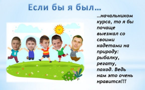 В своих работах кадеты фантазировали над ситуацией, где они выступают в роли учителя, воспитателя, начальника курса и других педагогов. Каков был бы стиль общения с кадетами? Как был бы устроен урок, и как бы выглядел сам педагог? Что бы изменилось в жизни училища? Как бы справлялись с нестандартной или конфликтной ситуацией?
