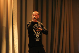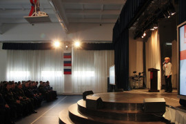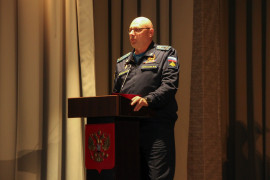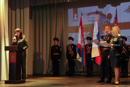 После внесения под марш оркестра СПКУ государственного флага Российской Федерации, флага Министерства обороны и Знамя училища, с приветственным словом к участникам и гостям Первенства обратился начальник Ставропольского президентского кадетского училища Преснухин Вячеслав Валерьевич: