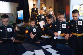 Для примера конкурсантам было предложено посмотреть один видеоролик из этой серии со звуком. Далее кадеты озвучивали тексты, а на экране началось мульти-путешествие по регионам России, которые знамениты своими традициями и ремёслами: Архангельск с его деревянными ажурными птицами счастья, Сергиев Посад с русской матрёшкой, Нижегородская область с золотой хохломой, Вятский край с дымковской игрушкой и многие другие.