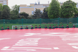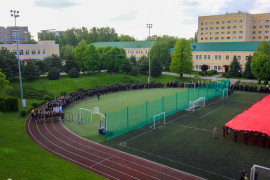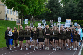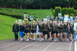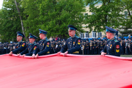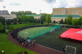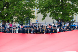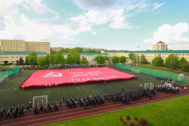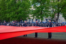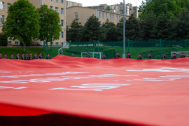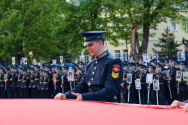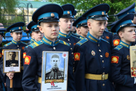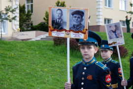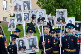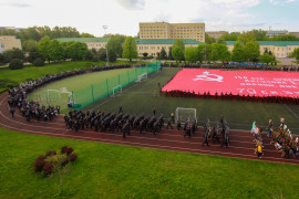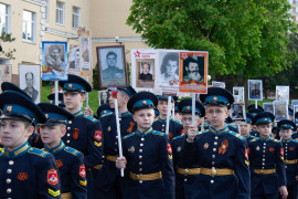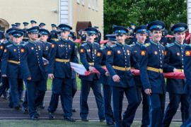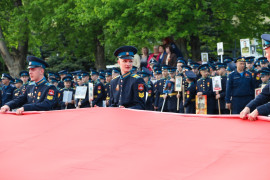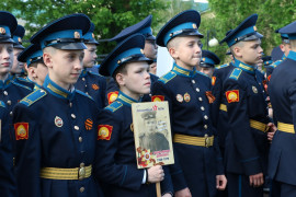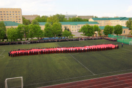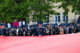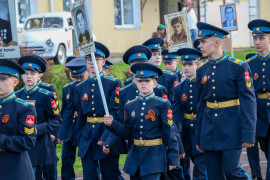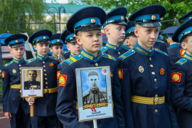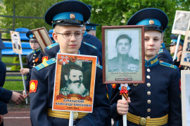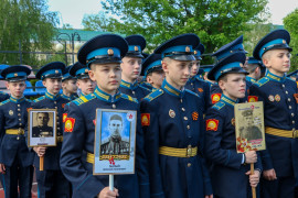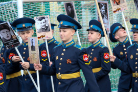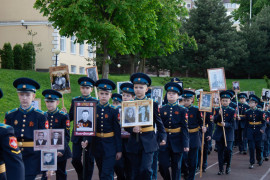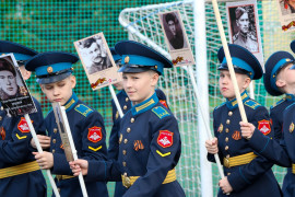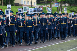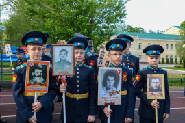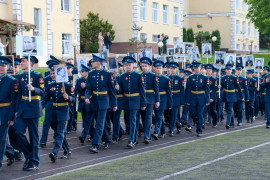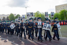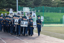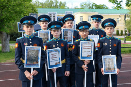 В этом году кадеты СПКУ встретили акцию на стадионе училища торжественным шествием «Бессмертного полка». Когда полотнище Знамени покрыло почти всю площадь стадиона, воспитанники всех курсов СПКУ и Аксайского кадетского корпуса вместе с педагогами прошли по периметру «Знамени Победы», неся в руках портреты своих дедов и прадедов, сражавшихся за Победу.
