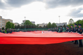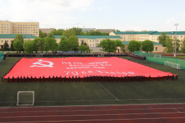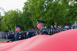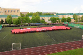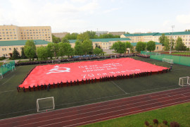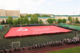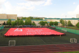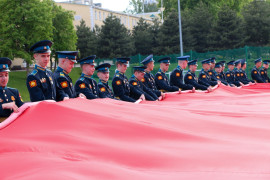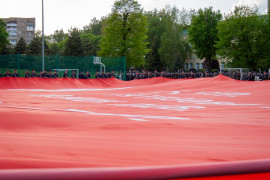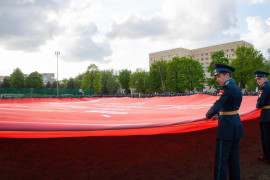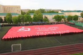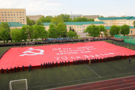 Затем под песню «День Победы» участники акции, кадеты Ставропольского президентского кадетского училища и Аксайского кадетского корпуса развернули над стадионом обновленную копию знамени Победы площадью почти 1,5 тысячи квадратных метров.