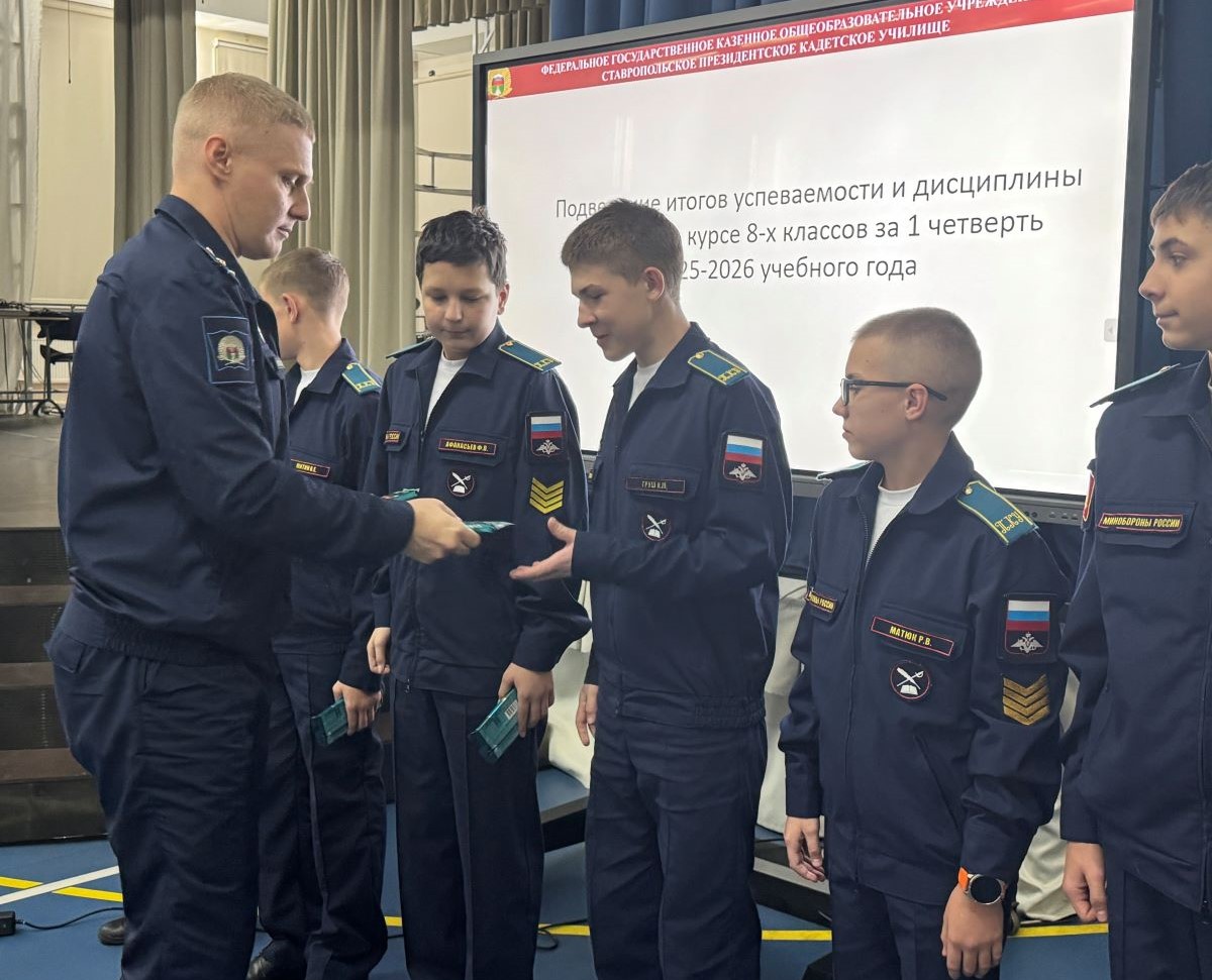 По итогам первой четверти 2025-2026 учебного года на учебном курсе 8-х классов были подведены итоги успеваемости, дисциплины и внеклассной активности кадет. Старший воспитатель курса Дмитрий Владимирович Корыпалов сообщил, что на курсе 18 отличников и это является достаточно хорошим результатом. Эти ребята продемонстрировали высокий уровень подготовки и ответственности, заслужив похвалу педагогов и администрации училища. Тем не менее начальник курса отметил, что у многих кадет есть все шансы пополнить ряды тех, кто показал отличные результаты в учёбе.